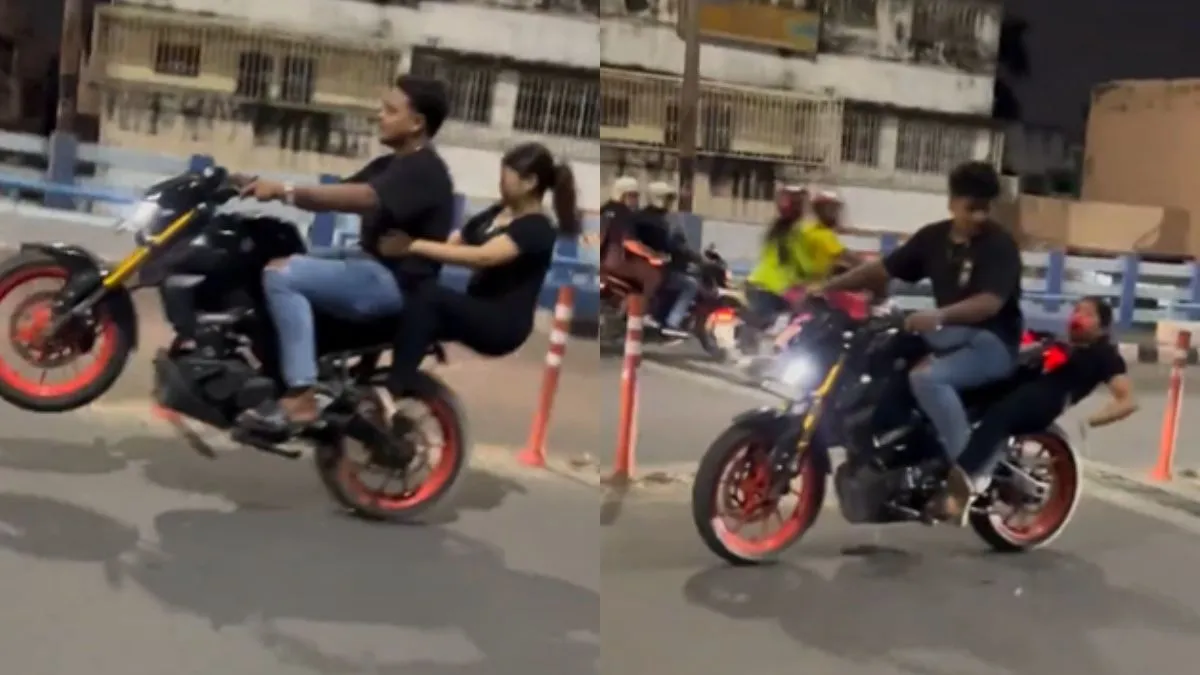 सोशल मीडिया पर वायरल हो रहे वीडियो में नजर आ रहा है कि एक लड़का स्पोर्ट्स बाइक चला रहा है। उसी बाइक पर पीछे एक लड़की भी बैठी हुई है। बाइक को चलाते हुए शख्स अचानक स्टंट करता है और बाइक के आगे वाले पहिए को हवा में उठाता है। इस दौरान पीछे बैठी लड़की झटके से पीठे वाले टायर पर गिर जाती है और टायर के घूमने के कारण वह बाइक की सीट और पहिए के बीच में बचे स्पेस में जाकर फंस जाती है। इसके तुरंत बाद लड़का बाइक को रोकता है और लड़की बाहर निकलती है। वीडियो सोशल मीडिया पर काफी वायरल हो रहा है।