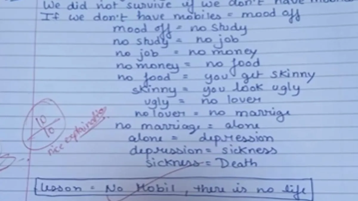 सोशल मीडिया पर वायरल हो रहे पोस्ट में एक सवाव और उसके नीचे उसका जवाब लिखा हुआ नजर आ रहा है। सवाल पूछा है कि, 'मोबाइल का इस्तेमाल क्या है?' इसके जवाब में बच्चे ने लिखा, 'मोबाइल हमारे जीवन में अहम भूमिका निभाते हैं। हमारे पास मोबाइल नहीं होगा तो हम जी नहीं सकते हैं। अगर फोन नहीं होगा तो मूड खराब रहेगा। इससे पढ़ाई नहीं हो पाएगी, फिर नौकरी नहीं मिलेगी, फिर पैसा नहीं होगा। पैसा नहीं होगा तो खाना नहीं मिलेगा और हम दुबले हो जाएंगे। इस वजह से गंदे दिखेंगे तो कोई प्यार नहीं करेगा। फिर शादी नहीं होगी। इसके बाद अकेले रहेंगे तो डिप्रेशन में चले जाएंगे। उससे बीमार होंग और फिर मौत हो जाएगी। इसका मतलब फोन नहीं तो जिंदगी नहीं।'