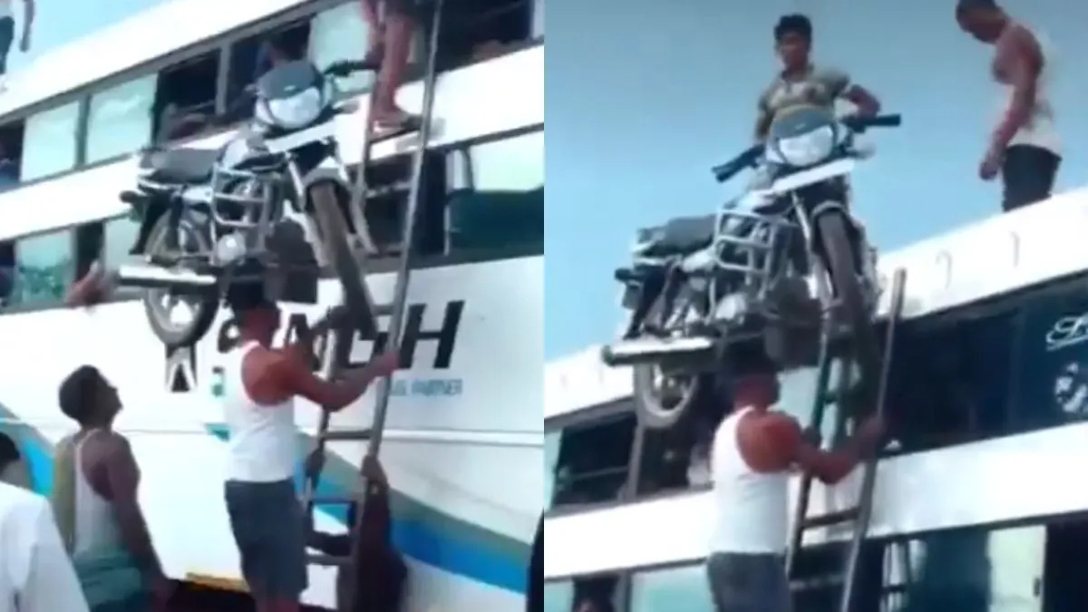 अभी जो वीडियो सोशल मीडिया पर वायरल हो रहा है उसमें नजर आता है कि एक जगह पर बस खड़ी है जिसमें सामान लोड हो रहा है। एक बाइक को बस की छत तक पहुंचाना है मगर इसके लिए किसी मशीन का नहीं बल्कि मजदूरों का इस्तेमाल हो रहा है। पहले तो कुछ लोग मिलकर बाइक को उठाते हैं और फिर उसे एक शख्स के सिर पर रख देते हैं। हैरानी तो यह देखकर होती है कि वह आदमी बाइक को सही से बैलेंस करते हुए सीढ़ी पर चढ़ता है और कुछ देर में बिल्कुल ऊपर तक पहुंच जाता है जहां कुछ लोग मिलकर उसे उतार लेते हैं।