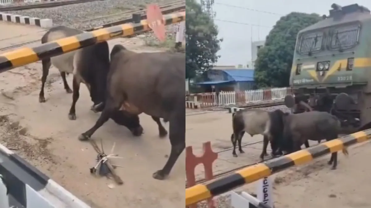 सड़क पर सांड की लड़ाई के वीडियो अक्सर वायरल होते रहते हैं। कई वीडियो में इन सांडों की लड़ाई में इंसान भी लपेटे में आ जाता है। कई बार सांडों की लड़ाई की वजह से दुर्घटनाएं भी हो जाती हैं। कई बार ये सांड अपने युद्ध में लोगों की प्रॉपर्टी, कार और अन्य गाड़ियों का भी नुकसान कर देते हैं। हाल में दो सांडों की लड़ाई का एक वीडियो सोशल मीडिया पर वायरल हो रहा है। जिसमें दो सांड एक रेलवे ट्रैक पर लड़ते नजर आ रहे हैं। पटरी पर सांडों को लड़ते देक ट्रेन के लोकोपायलट ने ट्रेन रोक दी। जिसके बाद फाटक पर मौजूद रेलकर्मी सांडों को भगाने की कोशिश करते दिखा।