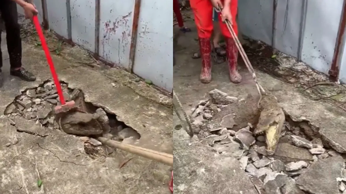दरअसल, वायरल हो रहे इस वीडियो में दो मगरमच्छों को सड़क के नीचे दबा हुआ देखा जा सकता है। जिन्हें सड़क को तोड़कर बाहर निकाला जा रहा है। वीडियो में आप देख सकते हैं कि एक शख्स सड़क को हथौड़े से मारकर तोड़ रहा है। सड़क के नीचे दबा हुआ एक मगरमच्छ अपना सिर बाहर निकाले हुए है। वहीं, कुछ लोग उस मगरमच्छ को काबू करने के लिए उसके गले में तार का फंदा लगा रहे हैं। अभी लोग पहले मगरमच्छ को काबू करने में लगे ही थे कि अंदर से एक और मगरमच्छ बाहर निकलता है और फुर्ती से दौड़कर वहां से भागने की कोशिश करता है। दूसरे मगरमच्छ के अंदर से निकलने का लोगों को कोई अंदाजा नहीं था इसलिए जैसे ही दूसरा मगरमच्छ बाहर आता है, लोग डर जाते हैं। वीडियो इसी प्वाइंट पर खत्म हो जाता है। वीडियो को देखने से यह अंदाजा लगाया जा सकता है कि उन दोनों मगरमच्छों को सफलतापूर्वक रेस्क्यू कर लिया गया होगा।