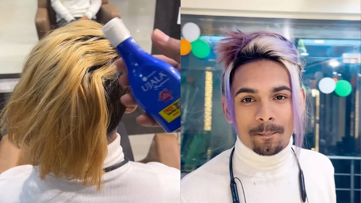 वायरल वीडियो में दिख रहा है कि एक सैलून में लड़का अपने बाल रंगवाने के लिए बैठा है। नाई अपने हाथ में उजाला नील की बॉल लिए हुए है और लड़के के बालों को नील से रंगने का एक्पेरिमेंट कर रहा है। आगे वीडियो में वह लड़के के बालों को शैंपू से धोता है फिर उन पर नील डालता है और अच्छे से बालों पर नील चढ़ाने के बाद वह ड्रायर से उसके बाल सूखाता है। इसके बाद लड़के के बालों पर नीले रंग के हाईलाइट्स दिखने लगते हैं। पहले लड़के के बालों का कलर क्रीम कलर था।