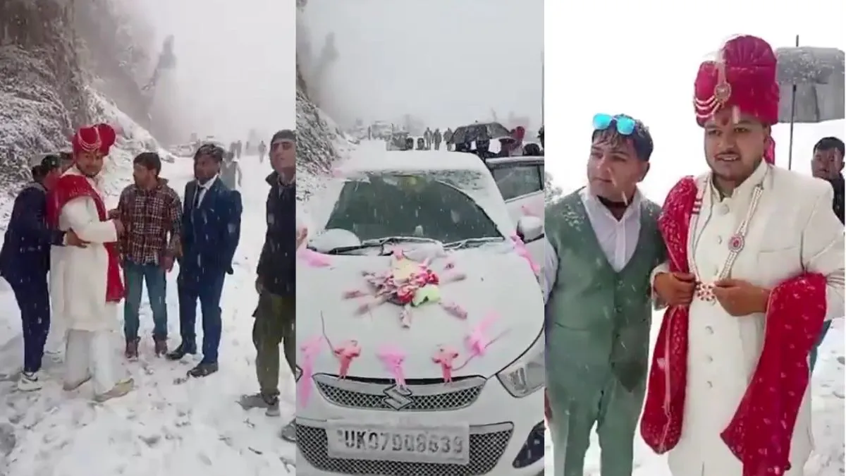 टिहरी गढ़वाल जिले के मोरियाना टॉप क्षेत्र में भारी बर्फबारी के कारण एक अनोखा नजारा देखने को मिला। अचानक हुई बर्फबारी से बारातियों के वाहन रास्ते में ही फंस गए, जिससे बारात का आगे बढ़ना मुश्किल हो गया। विवाह स्थल तक पहुंचने के लिए दूल्हे समेत सभी बारातियों को मजबूरी में बाकी रास्ता पैदल ही तय करना पड़ा। भारी बर्फ की परतें जमी होने के कारण सड़कें पूरी तरह जाम हो गई थीं। ऐसे हालात में दूल्हा और बाराती मोरियाना टॉप से बिंदाल कोटि तक पैदल चलते हुए दुल्हन को लेने पहुंचे।