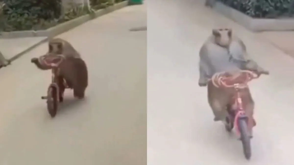 अभी सोशल मीडिया पर जो वीडियो वायरल हो रहा है उसमें नजर आता है कि एक बंदर अपने साइज के मुताबिक बनी साइकिल को लेकर दौड़ता है। इसके कुछ देर बाद वीडियो में नजर आता है कि वो बंदर उस साइकिल पर सवार है और इंसानों की तरह ही वो साइकिल को चला रहा है। दो लोग उसके पीछे धीमी रफ्तार में भागते हुए दिखते हैं और उन्हें देखते हुए बंदर साइकिल दौड़ाता हुआ नजर आता है जैसे उनसे बचकर वो कहीं भाग रहा है। इसकी जानकारी तो नहीं दी गई है कि यह वीडियो कब और कहां का है मगर अभी सोशल मीडिया पर काफी लोग इस वीडियो को देख रहे हैं।