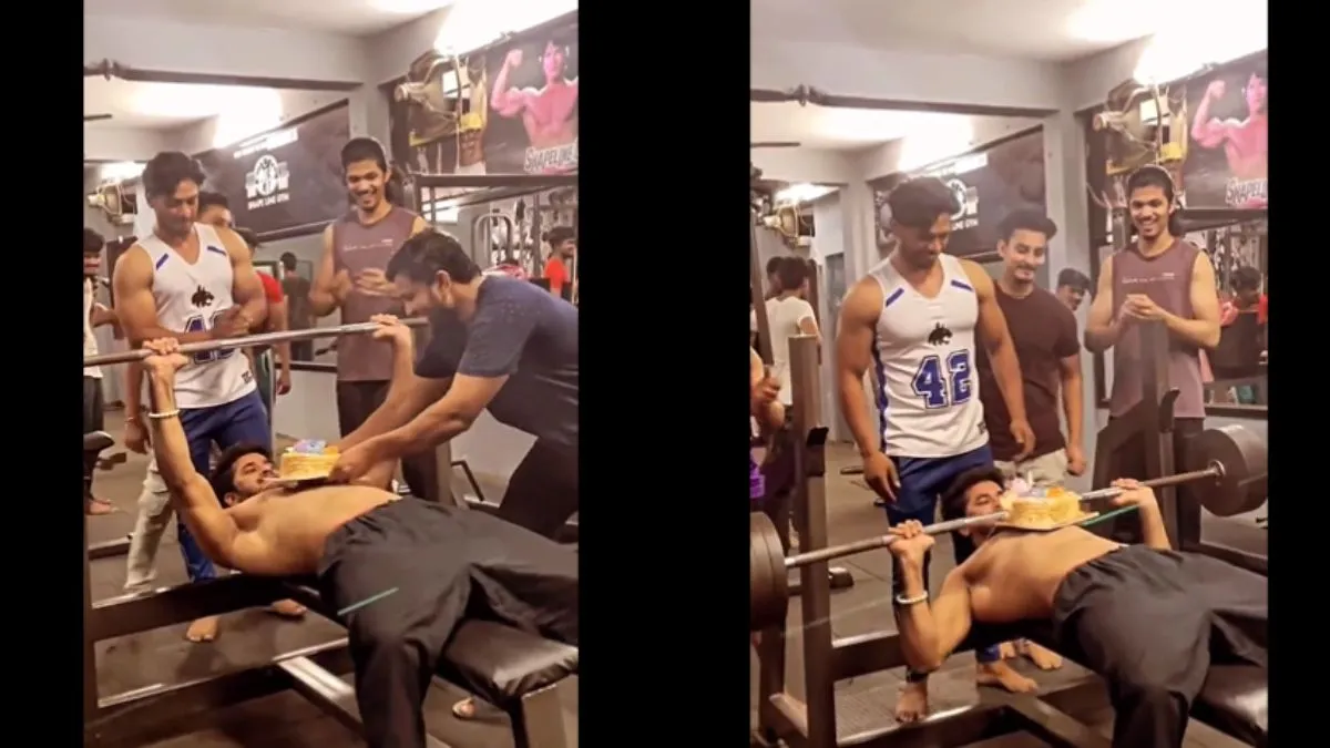 वायरल वीडियो में आप देख सकते हैं कि एक शख्स बहुत ही अनोखे तरीके से बेंच प्रेस करने के लिए बेंच पर लेटता है। इस दौरान उसके आस-पास कई और लड़के खड़े नजर आएंगे। वो शख्स जैसे ही बेंच प्रेस के लिए रॉड उठाता है, तभी एक दूसरा शख्स उसकी छाती पर केक रख देता है। इसके बाद बेंच प्रेस करने वाला शख्स रॉड से केक कटिंग करता है। इसके बाद केक को उसकी छाती से उठा लिया जाता है। बर्थडे बॉय उस रॉड में लगे केक को खाता है जिससे उसने केक काटा था और फिर उठ जाता है। इसके बाद वीडियो में वो शख्स अपनी बॉडी को दिखाता है और विक्टरी का निशान बनाता है। आपने क्या अभी तक ऐसा अनोखा तरीका देखा था।