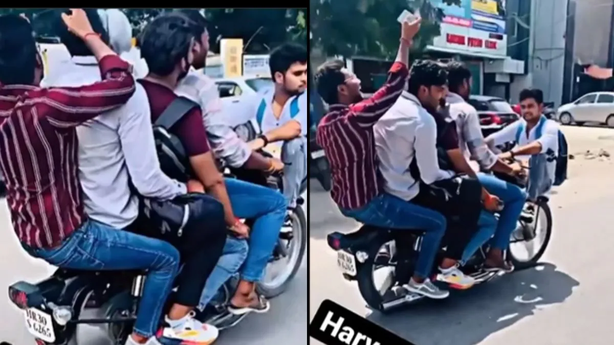 आप सभी ने कभी ना कभी बाइक तो चलाया ही होगा। कुछ लोग तो ऐसे भी होंगे जिन्हें बाइक चलाना ही पसंद होगा। आप सभी को पता होगा कि एक बाइक पर सिर्फ 2 लोग ही बैठ सकते हैं। मगर वायरल वीडियो में तो कुछ अलग ही नजर आ रहा है। वायरल वीडियो में नजर आ रहा है कि एक बाइक पर एक या दो नहीं बल्कि 5 लोग बैठे हुए हैं। तीन लोग तो सीट पर बैठे हुए हैं, चौथा शख्स पीछे जैसे-जैसे बैठा हुआ है। तो वहीं पांचवा शख्स फ्रंट मडगार्ड पर बैठा हुआ है। सभी बड़े ही मजे से बाइक की सवारी ले रहे हैं मगर ऐसा करना इनकी जान के लिए खतरनाक हो सकता है।