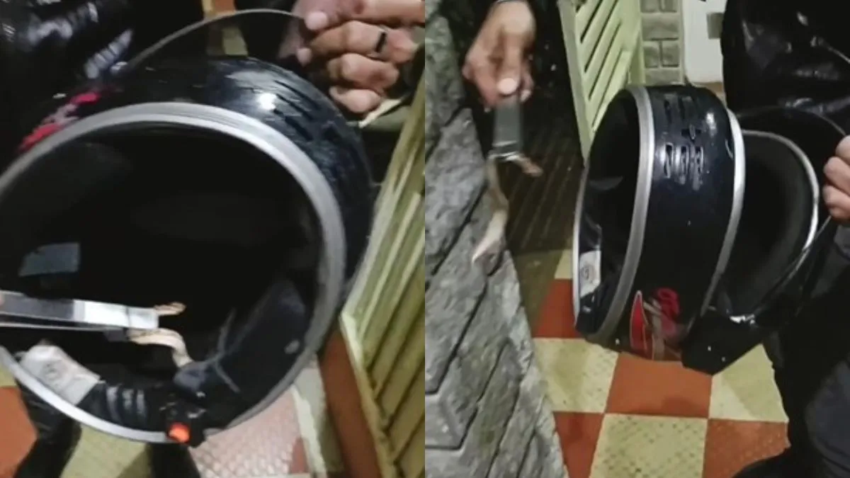 सोशल मीडिया पर आपने ऐसे कई वीडियो देखे होंगे जिसमें जुते से लेकर बाइक और कार के बोनट में सांप छुपे होते हैं। हाल में ऐसा ही एक वीडियो सामने आया है। जिसमें एक सांप को हेलमेट के अंदर छुपे हुए देखा जा सकता है। इस वीडियो को देखकर यूजर्स के पसीने छूट गए। कोई सोच भी नहीं सकता कि हेलमेट में भी सांप छुप सकता है। यह तो सोच कर ही रूह कांप जा रही है कि हेलमेट के अंदर सांप छुपा हुआ है। सोचिए अगर कोई बिना देखे उस हेलमेट को पहन ले तो क्या होगा।