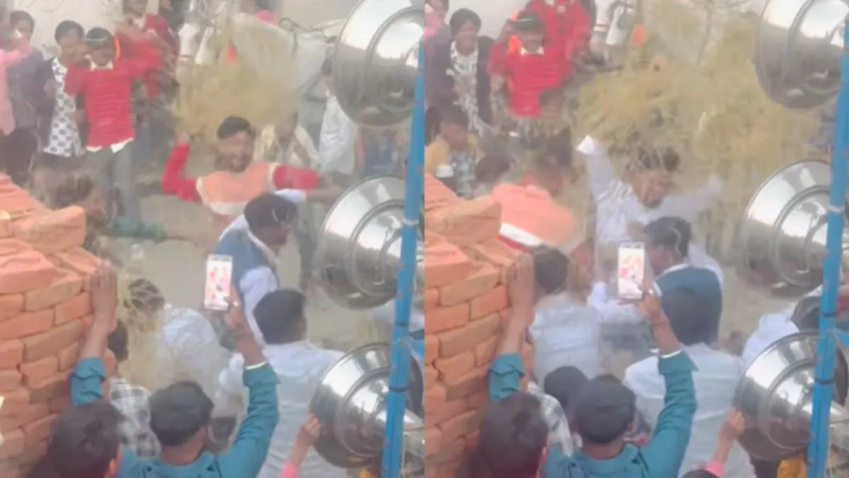 वीडियो में देखा जा सकता है कि शादी के दौरान जिस तरह से बाराती डांस कर रहे हैं, वह देख शायद ही किसी की हंसी कंट्रोल होगी। शायद ही आपने कभी इस तरह से किसी शादी में बारातियों को नाचते हुए देखा होगा। वीडियो में लोगों को ऐसे डांस करते हुए देख लोग इसे नया ट्रेंड बता रहे हैं। वीडियो में देखा जा सकता है कि शादी में धमाकेदार डीजे लगा हुआ है। जिस पर झन्नाटेदार गाना बज रहा है। जैसे ही DJ पर गाना बजता है, वैसे ही वहां मौजूद बारातियों में एक अलग ही तरह का जोश आ जाता है। जिसके बाद लोग पुआल का गठ्ठर हाथ में लिए DJ की ओर दौड़ते हैं और उस गठ्ठर को खोल पुआल उड़ा-उड़ाकर डांस करने लगते हैं। फिर क्या था, अगले ही पल ऐसा लगा जैसे सभी बारातियों पर भूत का साया आ गया है।
