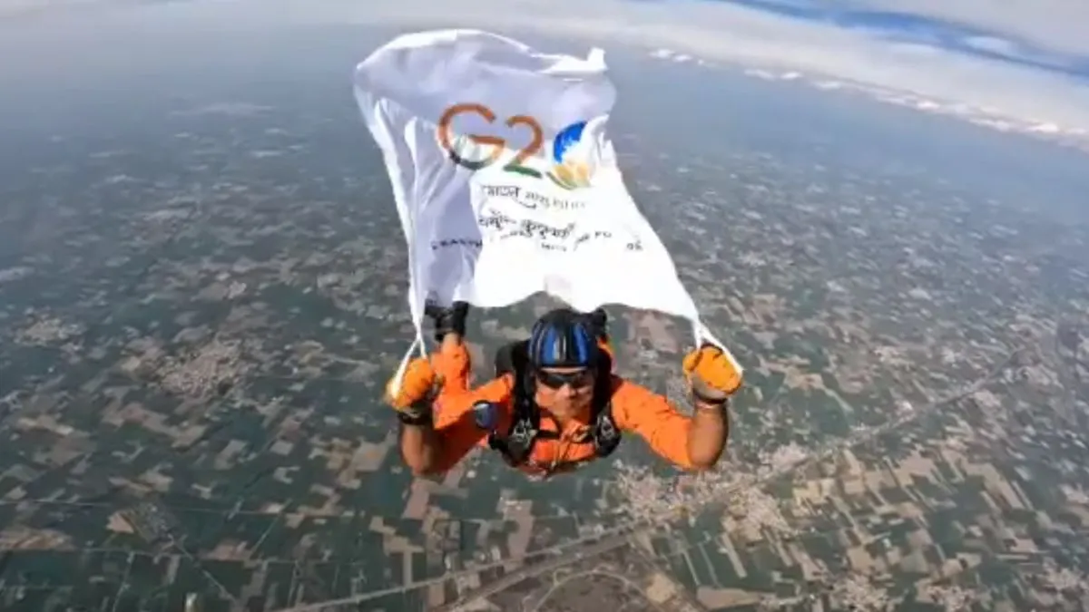 सोशल मीडिया पर एक वीडियो बहुत तेजी से वायरल हो रहा है। इस वीडियो में आप देख सकते हैं कि एक शख्स स्काईडाइविंग करते हुए खुले आसमान में G20 का एक झंडा लहराता हुआ दिखाई दे रहा है। इस वीडियो को माइक्रो ब्लॉगिंग प्लेटफॉर्म X(पहले ट्विटर) पर C PRO South Western Air Command के अकाउंट से शेयर किया गया है। इसमें उन्होंने जानकारी देते हुए बताया है कि, "वायु सेना स्टेशन मध द्वीप पर तैनात विंग कमांडर गजानंद यादव ने नीले आकाश में G20 शिखर सम्मेलन का जश्न मनाया। उन्होंने वायु सेना स्टेशन फलोदी में G20 के झंडे के साथ 10000 फीट की ऊंचाई से स्काइडाइविंग की।"