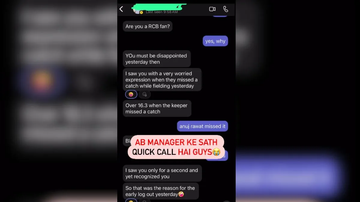 सोशल मीडिया पर एक वीडियो वायरल हो रहा जो स्टेडियम का है। RCB और लखनऊ का मैच देखने के लिए फैंस स्टेडियम पहुंचे। इन्हीं फैंस में से एक लड़की वो थी जो अपने ऑफिस में फैमिली इमरजेंसी बताकर जल्दी निकली और मैच देखने के लिए पहुंची। मगर एक कैच के दौरान जब कैमरामैन ने फैंस पर फोकस किया तो उसमें वह लड़की दिखी और उसे टीवी पर मैच देखते हुए उसके बॉस ने पहचान लिया। इसके बाद वीडियो में एक चैट का स्क्रीनशॉट भी नजर आ रहा है जिसमे बॉस और महिला के बीच बातचीत नजर आ रही है। बॉस उसे बता रहा है कि उसने उसे पहचान लिया था। महिला ने वीडियो में टेक्स्ट के जरिए बताया, 'अब मैनेजर के साथ क्विक कॉल है।'