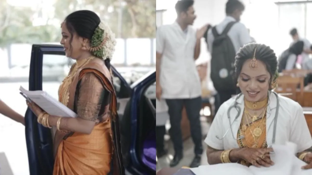 वायरल हो रहे इस वीडियो में आप देख सकते हैं कि एक महिला कार के अंदर बैठी हुई है। वह दुल्हन के लुक में नजर आ रही है। महिला दुल्हन की तरह सज-धज कर प्रैक्टिकल एग्जाम में शामिल होने जाती है। वीडियो को आगे देखने पर पता चलता है कि दुल्हन एक मेडिकल कॉलेज में पढ़ाती है, दुल्हन के शादी वाले दिन ही छात्रों का प्रैक्टिकल एग्जाम रहता है जिसे सफलता पूर्वक आयोजित करने के लिए वह एग्जाम सेंटर पर टाइम से पहले ही पहुंच जाती है। महिला को दुल्हन के लुक में देखकर हर कोई दंग रह गया।