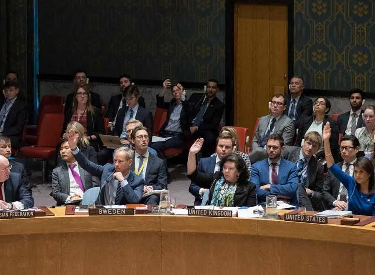 संयुक्त राष्ट्र: संयुक्त राष्ट्र सुरक्षा परिषद में सीरिया पर अमेरिका, फ्रांस व ब्रिटेन द्वारा किए गए हवाई हमलों की निंदा करने वाला रूसी प्रस्ताव खारिज हो गया है। समाचार एजेंसी सिन्हुआ के मुताबिक, सुरक्षा परिषद के 15 सदस्यों में से तीन- रूस, बोलीविया और चीन ने शनिवार को रूस के प्रस्ताव के पक्ष में मतदान किया। इसके अलावा चार देश इक्वाटोरियल गिनी, इथोपिया, कजाकिस्तान और पेरू ने वोटिंग से दूरी बनाए रखी। बाकी बचे आठ सदस्य देशों ने प्रस्ताव के विरोध में मतदान किया।
