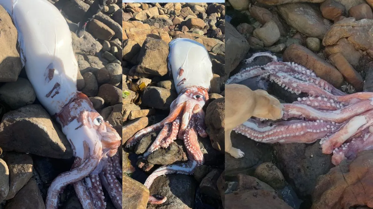 Giant Squid: दक्षिण अफ्रीका के समुद्र तट पर एक अजीबोगरीब समुद्री जीव मृत पाया गया है। यह एक विशाल स्क्विड है। ट्विटर यूजर टिम डी ने केप टाउन के एक समुद्र तट पर इस दुर्लभ प्रकार के समुद्री जीव को पाया है। यह अजीबोगरीब दिखने वाला समुद्री जीव मंगलवार को स्कारबोरो बीच पर मिला। टिम डी नाम के ट्विटर हैंडल पर इसकी फोटो और वीडियो शेयर की गई है, जिसमें रंग-बिरंगी स्क्वीड की बड़ी-बड़ी आंखें नजर आ रही हैं। ट्वीट में उन्होंने लिखा, 'यह अजीब दिखने वाला समुद्री जीव आज सुबह स्कारबोरो बीच पर मिला।' ट्विटर पर साझा किए गए एक वीडियो में एक समुद्री जीवविज्ञानी को स्क्विड की विशाल शिकारी चोंच को पकड़ते हुए दिखाया गया है। यह जीव अपनी बड़ी-बड़ी आंखों के लिए जाना जाता है। आमतौर पर यह 3.5 इंच की पुतली के साथ 11 इंच व्यास तक का होता है। इसकी बड़ी-बड़ी आंखों की खासियत है कि इनमें ज्यादा रोशनी आ सकती है। इसकी बड़ी आंखें बायोलुमिनसेंट प्रकाश का भी पता लगा सकती हैं, जो गहरे समुद्र में मिलना मुश्किल है।