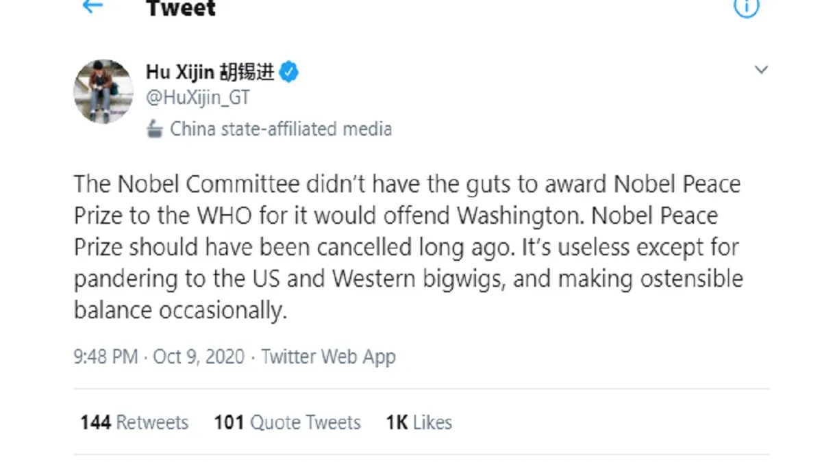 हू शिजिन ने ट्वीट में लिखा, "नोबेल कमिटी के अंदर इतना साहस नहीं है कि वह WHO को पुरस्कार दे क्योंकि इससे अमेरिका नाराज हो जाएगा। नोबेल पुरस्कार को बहुत पहले ही रद्द कर देना चाहिए था। यह पश्चिमी और अमेरिका के बडे़ लोगों की दलाली के अलावा कुछ नहीं करता। इससे कई बार बनावटी संतुलन बनाने का प्रयास होता है।" यहां गौरतलब है कि कोरोना काल के दौरान WHO पर चीन के इशारों पर काम करने के आरोप लगे हैं।