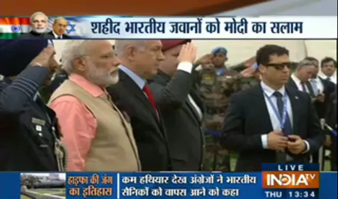 इजरायल की तीन दिनों की यात्रा के अंतिम दिन आज प्रधानमंत्री नरेंद्र मोदी हाइफा वार मेमेरियल पहुंचे जहां उन्होंने फर्स्ट वर्ल्ड वार में शहीद भारतीय सैनिकों को श्रद्धांजलि अर्पित की। प्रधानमंत्री मोदी के साथ इजरायल के पीएम बेजामिन नेतन्याहू भी साथ थे। 99 साल पहले हुए फर्स्ट वर्ल्ड वार भारतीय सेना ने हाइफा को तुर्की से आजाद कराया था। इस दौरान 44 भारतीय सैनिक शहीद हुए थे।