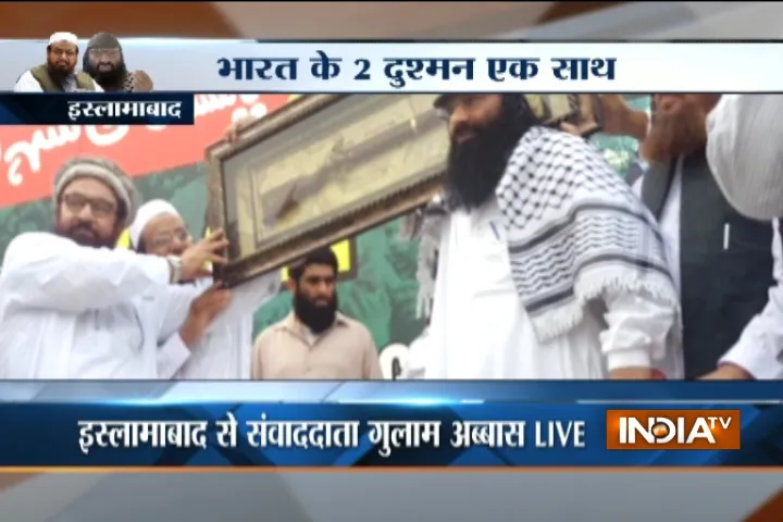 हिज्बुल मुजाहिद्दीन चीफ सलाउद्दीन की एक हैरान करने वाली तस्वीर सामने आई है। इन तस्वीरों में सलाउद्दीन को जमात-उद-दावा के कमांडर अब्दुल रहमान मक्की एक गन देते हुए दिखाई दे रहा है। ये गन हाफिज सईद की तरफ से सलाउद्दीन को तोहफे के तौर पर दी गई है। आतंकियों की ये रैली इस्लामाबाद में हुई थी जिसमें कई आतंकी शामिल हुए थे। मंच पर नवाज शरीफ की पार्टी पाकिस्तान मुस्लिम लीग का नेता जफर अली शाह भी मौजूद थे।