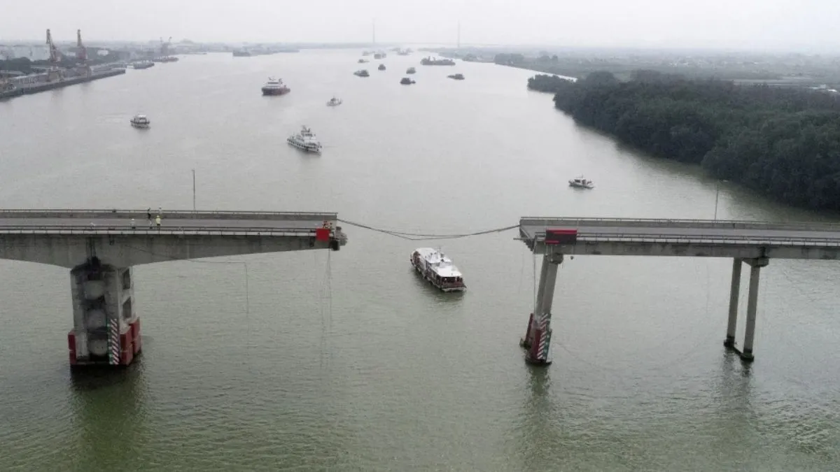 बीजिंग: चीन के गुआंगझोऊ शहर में बृहस्पतिवार को एक कंटेनर जहाज की टक्कर के बाद एक पुल का कुछ हिस्सा ढह गया। इससे दो लोगों की मौत हो गई। जबिक तीन अन्य लोग लापता हो गए। घायलों को अस्पताल में भर्ती करवाया गया है। इस भयानक हादसे में पांच वाहन भी क्षतिग्रस्त हो गए। घटना हांगकांग के उत्तर-पश्चिम में लगभग 90 किलोमीटर दूर गुआंगझोऊ में हुई। बताया जा रहा है कि गुआंगझोऊ के नान्शा जिले में लिक्सिंशा पुल से तड़के एक खाली कंटेनर जहाज टकरा गया, जिससे पुल का एक हिस्सा ढह गया।