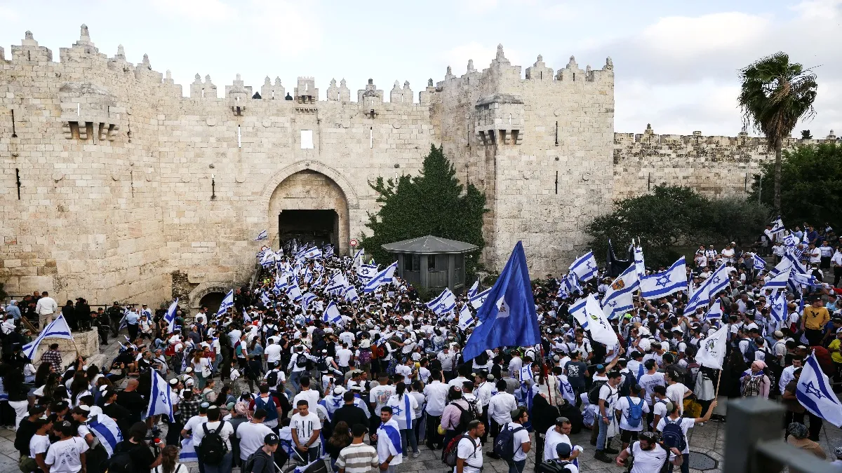 पूर्वी यरुशलम में फलस्तीनियों के लिए केंद्रीय सभा स्थल के तौर पर इस्तेमाल होने वाले दमिश्क गेट के बाहर एकत्र हुए प्रदर्शनकारियों ने अरब विरोधी और इस्लाम विरोधी नारे लगाए, नृत्य किया और जुलूस के आरंभ होने पर इजराइली झंडे लहराए। मार्च शुरू होने से ठीक पहले, भीड़ की पुलिस के साथ धक्का-मुक्की हुई और प्रदर्शनकारियों ने ‘प्रेस’लिखी जैकेट पहने एक पत्रकार पर प्लास्टिक की बोतलें फेंकी।