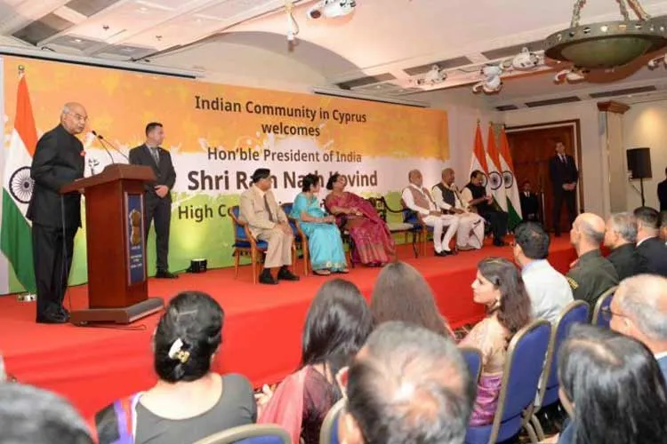लारनाका: राष्ट्रपति रामनाथ कोविंद यूरोप की अपनी तीन दिवसीय यात्रा के पहले चरण में रविवार को साइप्रस पहुंचे। कोविंद यूरोपीय देशों के साथ भारत के उच्च स्तरीय संपर्क को जारी रखने के वास्ते यूरोप के देशों की यात्रा पर है। राष्ट्रपति ने भारतीय समुदाय को संबोधित करते हुए कहा, "भारत को अपने प्रवासियों और उनकी उपलब्धियों पर गर्व है। वे भारत के सच्चे सांस्कृतिक राजदूत हैं और साइप्रस के साथ हमारे संबंधों को गहरा कर देंगे।"(सऊदी गठबंधन सेना ने सादा हमले में अपनी गलती मानी, 40 बच्चों समेत मारे गए थे 51 लोग )