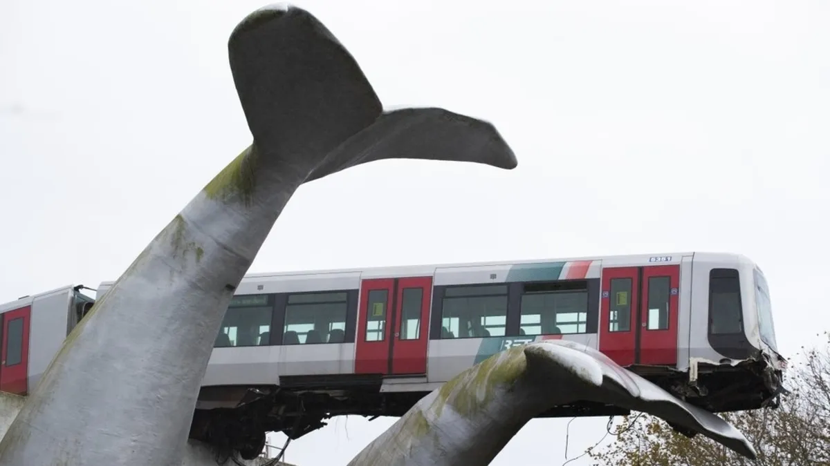 रोटरडैम: कहते हैं कि 'जाको राखे साइयां, मार सके न कोय', और नीदरलैंड्स में यही चीज एक बार फिर देखने को मिली। रिपोर्ट्स के मुताबिक, मेट्रो ट्रेन अपने ट्रैक से आगे बढ़ गई थी और कई फीट नीचे ही गिरने वाली थी कि ट्रैक के सामने ही बने व्हेल की पूंछ के स्कल्पचर पर आकर अटक गई। बता दें कि दुर्घटनास्थल पर व्हेल की 2 पूंछों का स्कल्पचर बना हुआ था, और ट्रेन उनमें से ही एक पर आकर अटकी थी।
