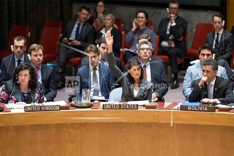 संयुक्त राष्ट्र: संयुक्त राष्ट्र सुरक्षा परिषद में फिलीस्तीन पर दो प्रस्तावों पर वोटिंग के दौरान इस्राइल के बचाव में अमेरिका पूरी तरह से अलग-थलग पड़ गया। इनमें से एक प्रस्ताव कुवैत ने पेश किया जबकि अमेरिका ने उसके विरोध में प्रस्ताव पटल पर रखा। सुरक्षा परिषद में इन दोनों प्रस्तावों पर वोटिंग हुई। इस दौरान अमेरिका के निकटतम सहयोगियों ने भी अमेरिका का साथ छोड़ दिया जबकि संयुक्त राष्ट्र में अमेरिका की स्थायी प्रतिनिधि निकी हेली ने कुवैत की ओर से पेश प्रस्ताव पर वीटो कर दिया और उसके विरोध में एक प्रस्ताव पेश किया, जिसे सिर्फ एक ही वोट मिला।