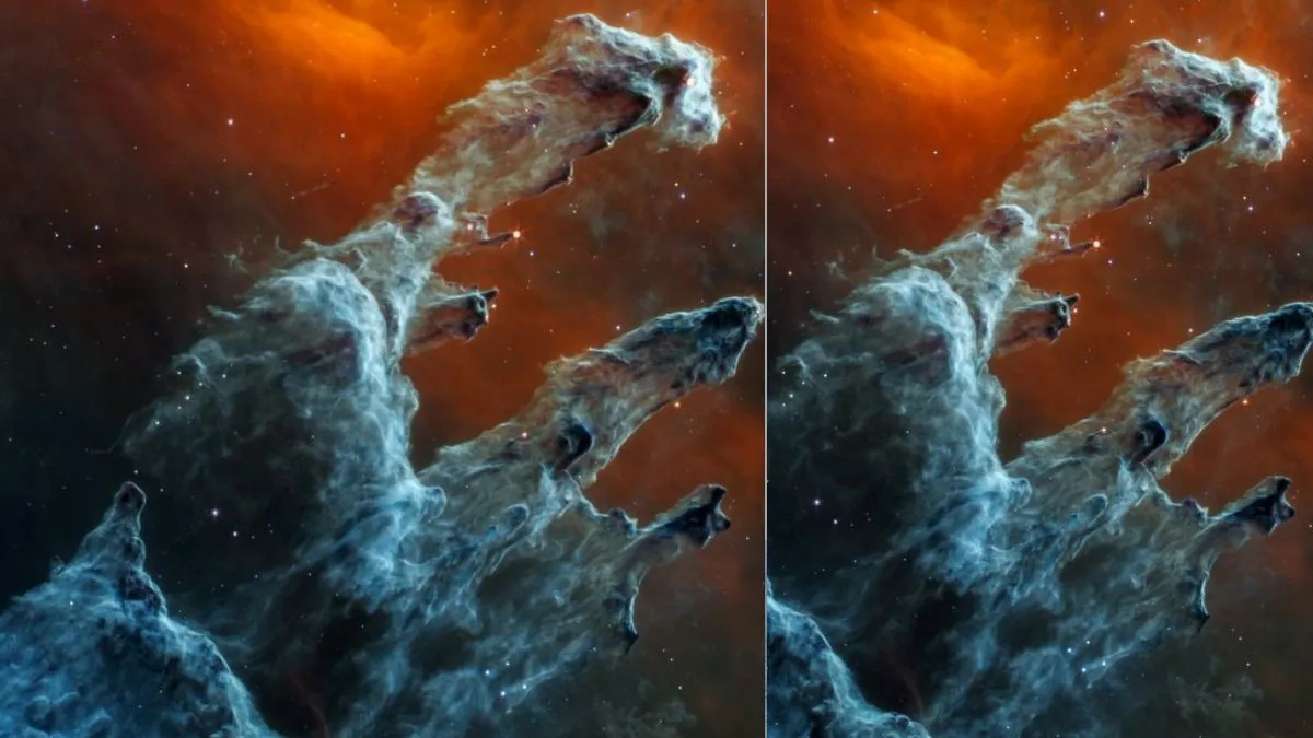 तस्वीर को शेयर करते हुए नासा ने अपने इंस्टाग्राम पर लिखा है, 'आप इसके चंगुल से बच नहीं सकते हैं।' जेम्स वेब स्पेस टेलीस्कोप ने पिलर्स ऑफ क्रिएशन की डार्क साइड की तस्वीर ली है। ये जगह 6500 प्रकाश वर्ष की दूरी पर ईगल नेबुला में स्थित है। बीते महीने भी जेम्स वेब स्पेस टेलीस्कोप ने पिलर्स ऑफ क्रिएशन की खूबसूरत तस्वीर ली थीं। ये खगोलीय 'टावर' तारे के बीच की धूल और गैस से बने हैं और नए सितारों की चमक हैं। ये संरचनाएं उतनी ही बड़ी हैं, जितनी कि ये तस्वीरों में दिखाई देती हैं। इनकी लंबाई लगभग 5 प्रकाश वर्ष होती है।