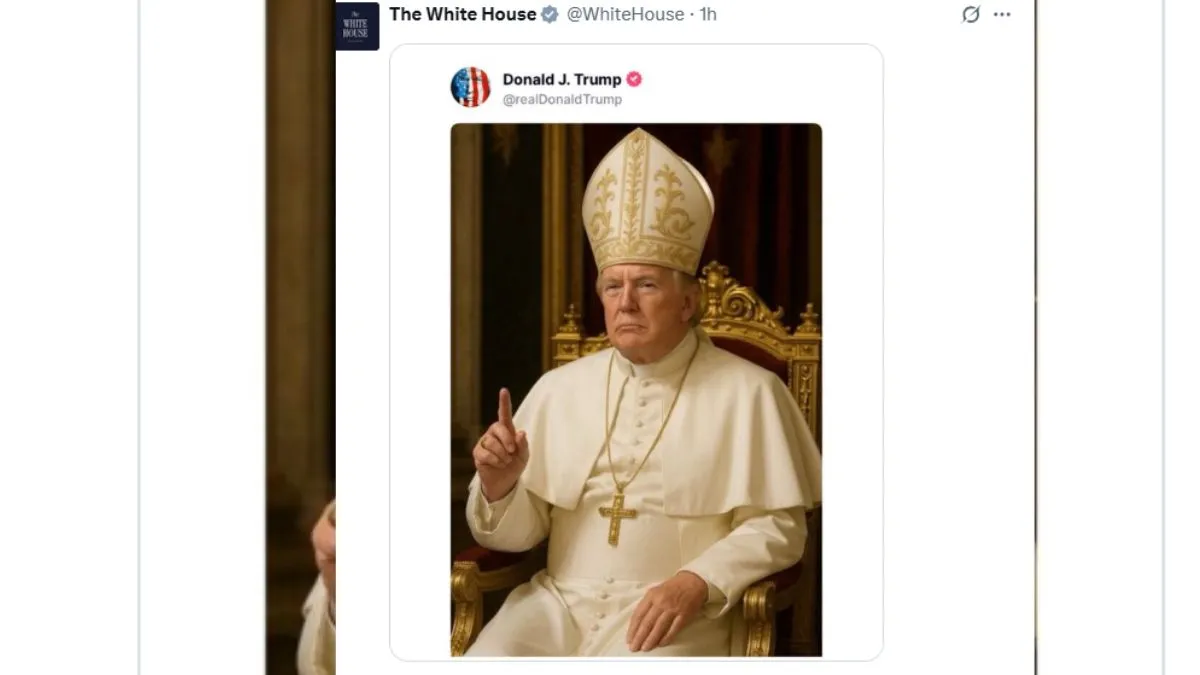 वाशिंगटनः पोप फ्रांसिस के बाद अमेरिका के राष्ट्रपति डोनाल्ड ट्रंप नये पोप बन गए हैं। ह्वाइट हाउस ने उनकी हैरतअंगेज तस्वीर पोस्ट की है। यह देखकर हर कोई हैरान है। ह्वाइट हाउस की ओर से पोस्ट की गई तस्वीर में राष्ट्रपति ट्रंप पोप की पोशाक पहने एक कुर्सी पर असली पोप की मुद्रा में बैठे हुए हैं। हालांकि यह एक एआई जनरेटेड तस्वीर है। मगर इस पोस्ट ने बवाल मचा दिया है। सोशल मीडिया में कई उपयोगकर्ताओं ने इसे ट्रंप द्वारा पोप फ्रांसिस की मौत का मज़ाक उड़ाना बताया है।