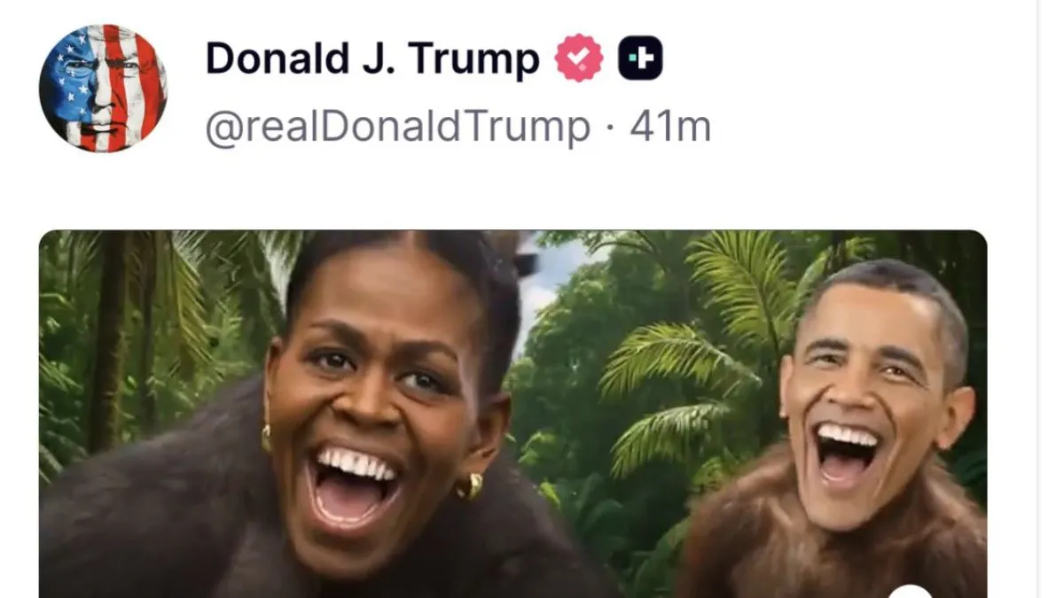 वाशिंगटन: अमेरिका के राष्ट्रपति डोनाल्ड ट्रंप के एक सोशल मीडिया पोस्ट ने बवाल मचा दिया है। ट्रंप ने अपने ट्र्थ सोशल मीडिया पर एक ऐसा नस्लवादी पोस्ट कर दिया, जिसमें पूर्व राष्ट्रपति बराक ओबामा और उनकी पत्नी मिशेल ओबामा को जंगल में प्राइमेट्स (वानरों) के रूप में दिखाया गया था। इससे अमेरिका में भारी बवाल हो गया। हालांकि बैकलैश के बाद उस वीडियो को ट्रंप के एकाउंट से डिलीट कर दिया गया। बावजूद मामला अभी थमा नहीं है।