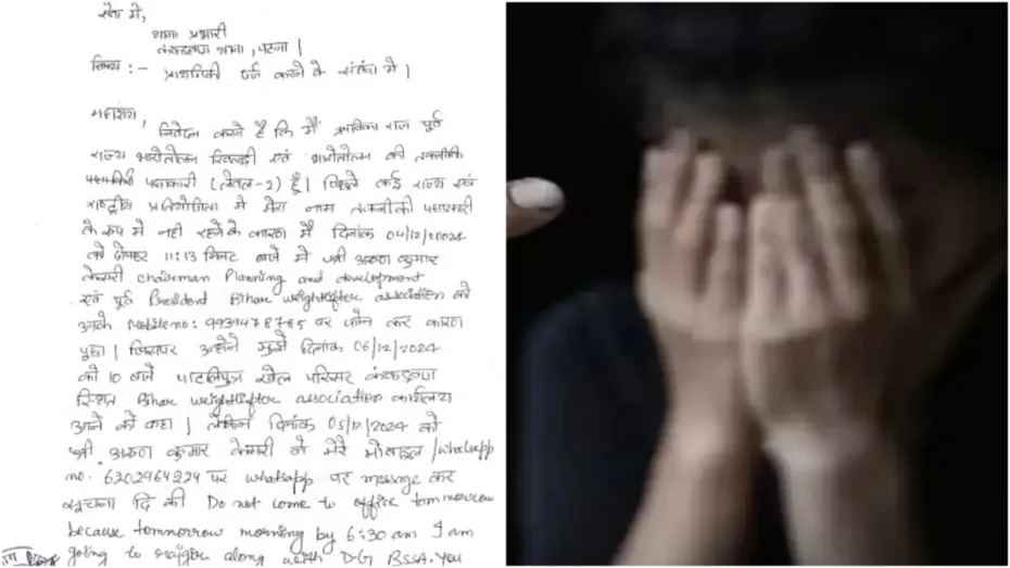 बता दें कि फिलहाल पीड़िता कैमरे पर बात नहीं करना चाहती है। हालांकि उसने पुलिस में जो लिखित में शिकायत की है, वह चिट्ठी हमारे पास मौजूद है। पीड़िता ने पुलिस को दिए शिकायत पत्र में लिखा, "पिछले कई राज्य एंव राष्ट्रीय प्रतियोगिता में मेरा नाम तकनीकी पदाधिकारी के रूप में नहीं रहने के कारण 4 दिसंबर 2024 की दोपहर 11.13 बजे मैंने अरुण कुमार केसरी को फोन कर पूछा। इसपर उन्होंने मुझे 6 दिसंबर 2024 को कंकड़बाग स्थिति पाटलिपुत्र खेल परिसर आने को कहा। महिला इसके बाद पाटलिपुत्र खेल परिषद स्थिति बिहार वेटलिफ्टिंग एसोसिएशन के कार्यालय पहुंची। यहां अरुण केसरी कार्यालय में अकेले मौजूद थे थोड़ी देर बात करने के बाद अरुण कुमार केसरी ने कहा कि यदि तुम मुझे कमरे में खुश नहीं करोगी तो किसी प्रतियोगिता में तुम्हारी रेफरी के रूप में नाम नहीं दूंगा।"