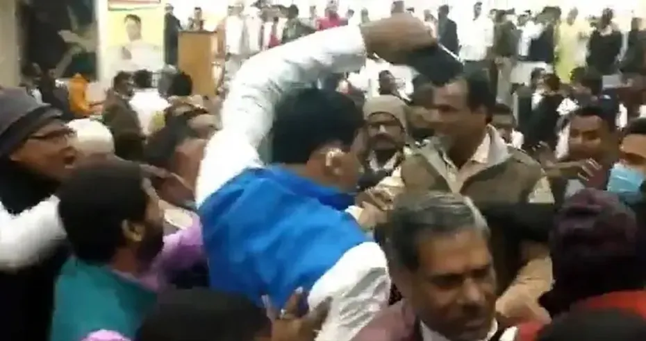 हंगामा तब हुआ जब किसान प्रकोष्ठ के नेता राम कुमार शर्मा ने मंच से बोलने की इच्छा जताई। इस दौरान दूसरे गुट के लोगों ने उन्हें बैठने को कहा। बात और तकरार इस कदर बढ़ी की हॉल के अंदर मारपीट तक हो गई। इस दौरान दोनों तरफ से कुर्सियां तक फेंक कर हमला किया गया।