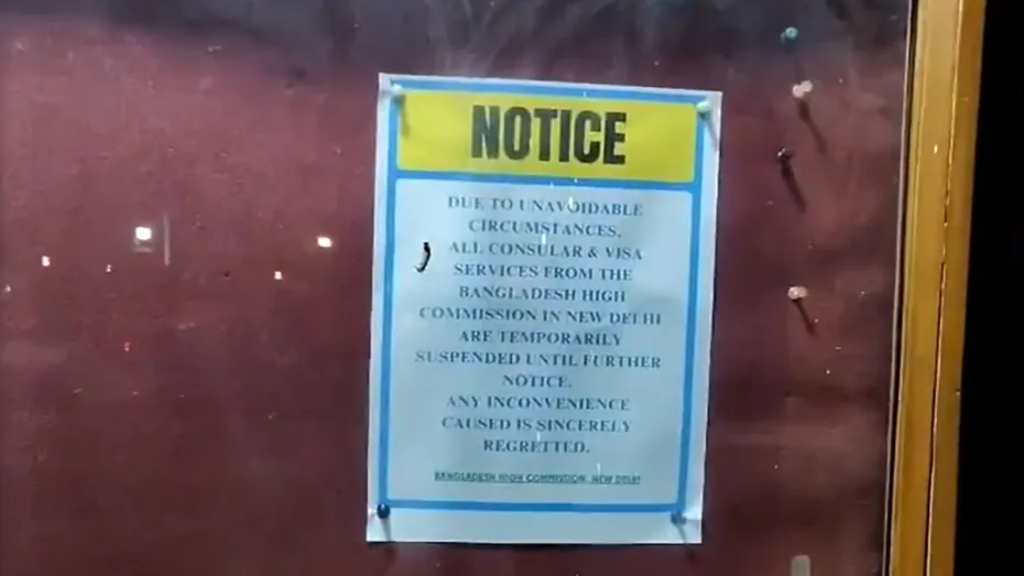 नई दिल्ली: बांग्लादेश में बढ़ती अशांति के बीच दिल्ली से एक बड़ी खबर सामने आई है। दिल्ली में बांग्लादेश हाई कमीशन के बाहर एक नोटिस लगाया गया है। नोटिस में लिखा है, "कुछ ज़रूरी कारणों से, नई दिल्ली में बांग्लादेश हाई कमीशन से सभी कांसुलर और वीजा सेवाएं अगले आदेश तक अस्थायी रूप से बंद कर दी गई हैं।"