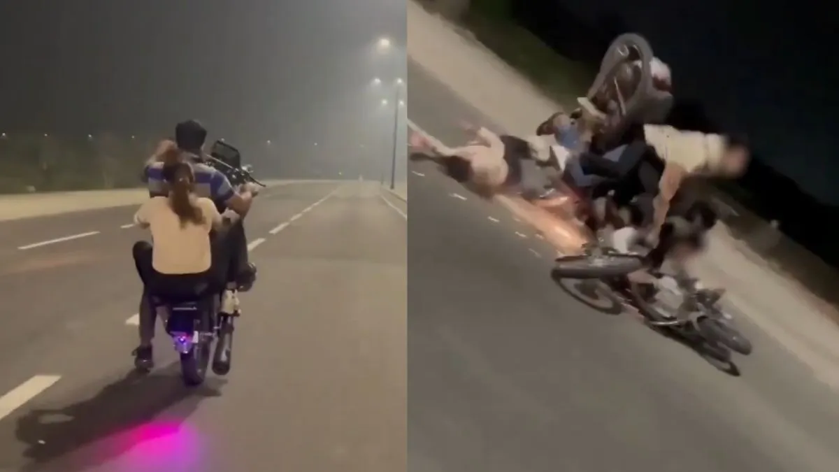 इस वीडियो में दिख रहा है कि रीलबाज स्टंट करते हुए, अपनी बाइक का अगला पहिया हवा में उठाकर बीच सड़क पर जा रहा है। तभी बैलेंस बिगड़ता है कि रीलबाज लड़के की बाइक गिर जाती है। इसकी वजह से वह लड़का खुद और उसकी बाइक पर पीछे बैठी लड़की, दोनों सड़क पर गिर जाते हैं। इतना ही नहीं एक बाइक उनके साथ-साथ चल रही थी, वह इनकी बाइक से टकराकर गिर जाती है।