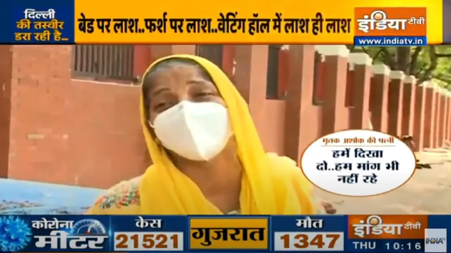 मृतक अशोक की पत्नी ने कहा, "7 दिन से देख रही हूं, लोग भटकते हैं, कोई फोन नहीं उठाता, एक बेचारे गरीब बैठे थे परेशानी में, उसको पता भी नहीं है, उसके फोन पर मैसेज आया की तेरी बीवी खत्म हो गई, वो बैठा था कि मिलने जाऊंगा, मेरी बेटी को फोन दिखाया, उसने कहा तुम्हारी बीबी खत्म हो गई, तुमको फोन पर बता दिया गया, उसने कहा मुझे तो पता ही नहीं है, मुझे पढ़ना नहीं आता, मैं कैसे करूं, बेचारे भटकते रहे, पता नहीं शव दिया या नहीं दिया, सबके साथ ऐसा ही हो रहा है, लोग भाग भागकर अस्पताल आ रहे हैं, अरे क्यों आ रहे हैं अपने घर में रहो, कम से कम घर में अच्छी देखरेग होगी, तुम घर में ठीक हो जाओगे, उनको वेंटीलेटर की जरूरत थी, नहीं दिया वेंटीलेटर, ऑक्सीजन भी अच्छा मिल जाता तो ठीक हो जाते, थोड़ा है वो और ज्यादा हो जाता है, वो दस जनों के साथ जाते हैं, कोई ज्यादा बीमार भी है, किसी को शुगर है, हर्ट अटैक है, सब एक साथ जाते हैं, ना तो हमें बता रहे हैं कि कि समय हम जाएंगे, हमें दिखा दो, हम मांग भी नहीं रहे, हमें दिखा तो दो।"