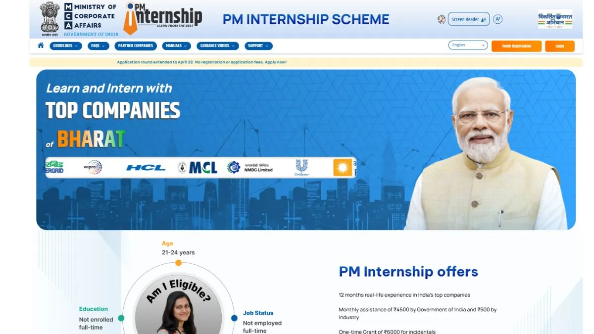 प्राइम मिनिस्टर इंटर्नशिप स्कीम (PMIS) के दूसरे फेज के लिए रजिस्ट्रेशन आज 22 अप्रैल को बंद किए जाएंगे। ऐसे में जो उम्मीदवार कॉलेज से निकलते ही या कॉलेज के दौरान देश की टॉपर कंपनियों में इंटर्नशिप करना चाहते हैं वे आधिकारिक वेबसाइट pminternship.mca.gov.in. पर जाकर आवेदन कर सकते हैं। बता दें कि पहले यह रजिस्ट्रेशन 31 मार्च को खत्म होने वाला था जिसे बढ़ाकर 15 अप्रैल किया गया और फिर से बढ़ाकर 22 अप्रैल कर दिया गया। ऐसे में आइए जानते हैं कि पीएम इंटर्नशिप स्कीम, एलिजिबिलिटी क्राइटेरिया और फायदे के बारे में...