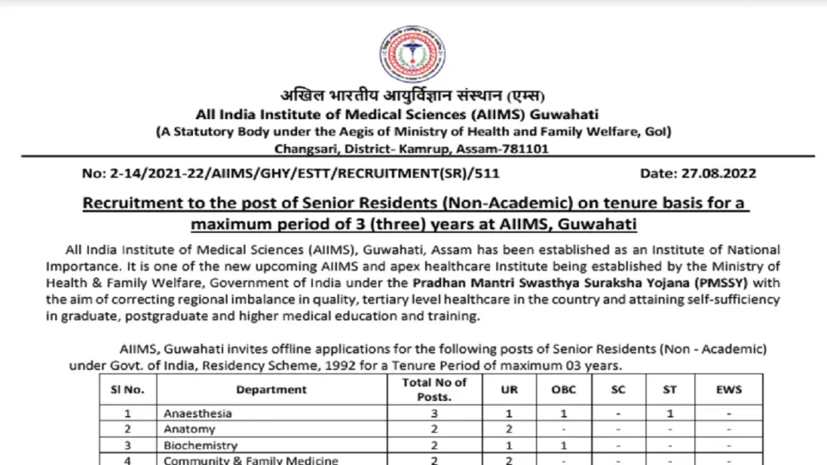 Sarkari Naukri: सरकारी नौकरी पाने के इच्छुक युवाओं के लिए ऑल इंडिया इंस्टीट्यूट ऑफ मेडिकल साइंस ने भर्ती (AIIMS Recruitment 2022) निकाली है। ये भर्ती सीनियर रेजीडेंट पदों के लिए हो रही है। रिक्त पदों की संख्या 40 है और आवेदन करने की आखिरी तारीख 25 सितंबर 2022 है। इच्छुक और योग्य उम्मीदवार आधिकारिक वेबसाइट aiimsguwahati.ac.in पर जाकर ऑफलाइन फॉर्म डाउनलोड कर सकते हैं। एमडी,एमएस, डीएनबी क्वालीफाई कर चुके कैंडीडेट आवेदन करने के योग्य हैं।