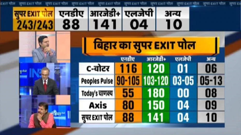 एबीपी-सी वोटर एग्जिट पोल के अनुसार राजग को 104-128 सीटें और विपक्षी महागठबंधन को 108-131 सीटें मिल सकती हैं। इसमें चिराग पासवान नीत लोजपा को 1-3 सीटें मिलने का अनुमान है। टाइम्स नाउ-सीवोटर के अनुसार राजग को 116, विपक्षी महागठबंधन को 120 और लोजपा को एक सीट मिल सकती है। रिपब्लिक टीवी-जन की बात के एक्जिट पोल ने भी राजद नीत गठबंधन को 128 सीटों के साथ स्पष्ट बहुमत दिया है वहीं उसने सत्तारूढ़ राजग को 104 सीटें तथा लोजपा को सात सीटें मिलने का अनुमान लगाया है।