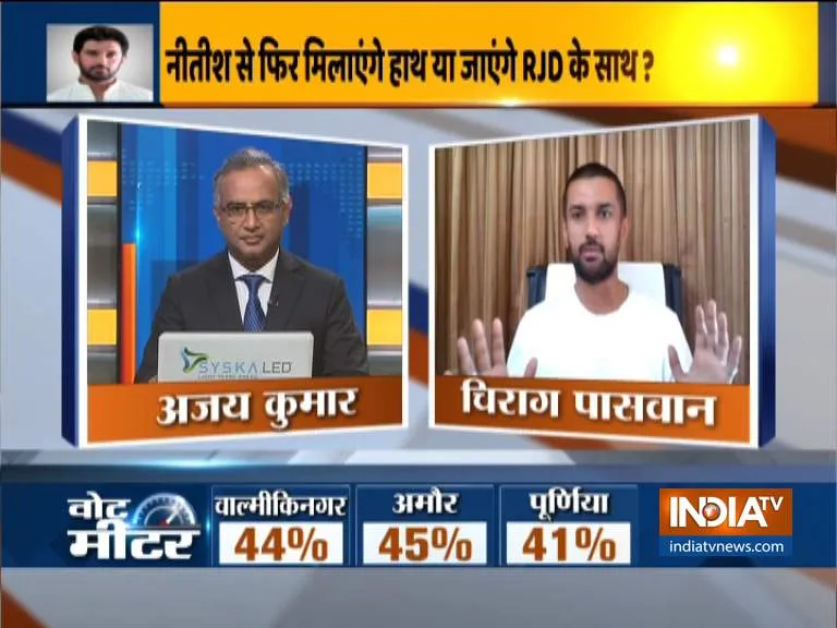 नई दिल्ली/पटना: इंडिया टीवी से खास बातचीत में LJP नेता चिराग पासवान ने बहुत ही स्पष्ट शब्दों में कहा कि भाजपा के मुख्यमंत्री को उनकी पार्टी और विधायकों का समर्थन होगा लेकिन वह नीतीश कुमार को मुख्यमंत्री बनते नहीं देखना चाहते हैं। उससे बेहतर वह विपक्ष में बैठना पसंद करेंगे। इतना ही नहीं उन्होंने कहा, "मैं PM मोदी के साथ कल भी गठबंधन में था, आज भी हूं और हमेशा उनके साथ रहूंगा।"