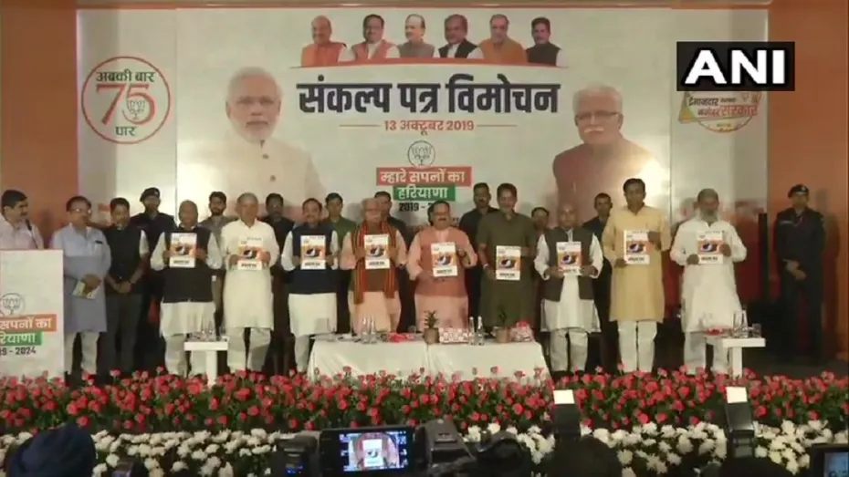 चंडीगढ़: हरियाणा चुनाव में बीजेपी ने अपना घोषणा पत्र जारी कर दिया है। चंडीगढ़ में बीजेपी के कार्यकारी अध्यक्ष जेपी नड्डा और हरियाणा के सीएम मनोहर लाल खट्टर ने बीजेपी का घोषणा पत्र जारी किया। बीजेपी ने इस संकल्प पत्र का नाम 'म्हारे सपनों का हरियाणा' दिया है। बीजेपी के इस संकल्प पत्र में 15 चैप्टर और 248 प्वाइंट हैं। सीएम मनोहर लाल खट्टर ने इस संकल्प पत्र को राम राज्य के सिद्धांतों पर आधारित बताया है। साथ ही उन्होंने कहा कि यह घोषणा पत्र उनके लिए सिलेबस की तरह है।