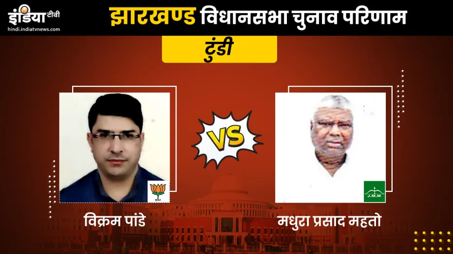 Jharkhand Election Results: झारखंड विधानसभा के लिए हुए चुनावों टुंडी विधानसभा सीट पर झारखंड मुक्ति मोर्चा (JMM) का कब्जा हो गया है। इस सीट पर जेएमएम के मथुरा प्रसाद महतो ने अपने निकटतम प्रतिद्वंदी भाजपा के प्रत्याशी विक्रम पांडेय को 25659 वोटों से हराया। महतो को 72552 वोट मिले जबकि पांडेय को 46893 वोट मिले। बता दें कि इस सीट पर मुख्य मुकाबला भारतीय जनता पार्टी और झारखंड मुक्ति मोर्चा (JMM) के प्रत्याशी के बीच था। चुनाव में भाजपा के मुकाबले झारखंड मुक्ति मोर्चा, कांग्रेस और राष्ट्रीय जनता दल ने संयुक्त प्रत्याशी उतारे थे। भाजपा ने इस बार विक्रम पांडे को मैदान में उतारा था जबकि जेएमएम ने मथुरा प्रसाद महतो पर दांव खेला था।