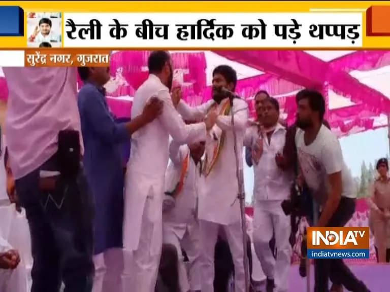 सुरेंद्रनगर। गुजरात के युवा नेता और हाल में कांग्रेस में शामिल हुए हार्दिक पटेल को एक जनसभा के दौरान थप्पड़ मारा गया। हार्दिक शुक्रवार को राज्य की सुरेंद्र नगर लोक सभा सीट के लिए एक रैली में चुनाव प्रचार कर रहे थे। इसी दौरान भीड़ से निकल कर एक शख्स उनके पास आया और उन्हें एक जोरदार थप्पड़ मार दिया। घटना के बाद भीड़ में शामिल समर्थकों ने तुरंत उस शख्स को पकड़ कर उसके साथ हाथापाई शुरू कर दी। बाद में उसे पुलिस के हवाले कर दिया गया। सुरेंद्रनगर लोकसभा सीट से कांग्रेस उम्मीदवार सोमा पटेल भी इस दौरान मंच पर मौजूद थे।