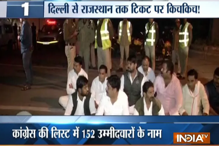 नई दिल्ली: राजस्थान विधानसभा चुनाव को लेकर कांग्रेस की पहली लिस्ट जारी होते ही दिल्ली से लेकर जयपुर तक हंगामा शुरू हो गया। दिल्ली में कांग्रेस मुख्यालय के साथ ही कांग्रेस अध्यक्ष राहुल गांधी के घर के सामने भी आधी रात के बाद कुछ कार्यकर्ता पहुंच गए और नारेबाजी करने लगे। आखिरकार नारेबाजी कर रहे कांग्रेस के इन कार्यकर्ताओं को पुलिस अपने साथ ले गई। जिन नेताओं का टिकट कटा उनके समर्थक धरने पर बैठ गए।