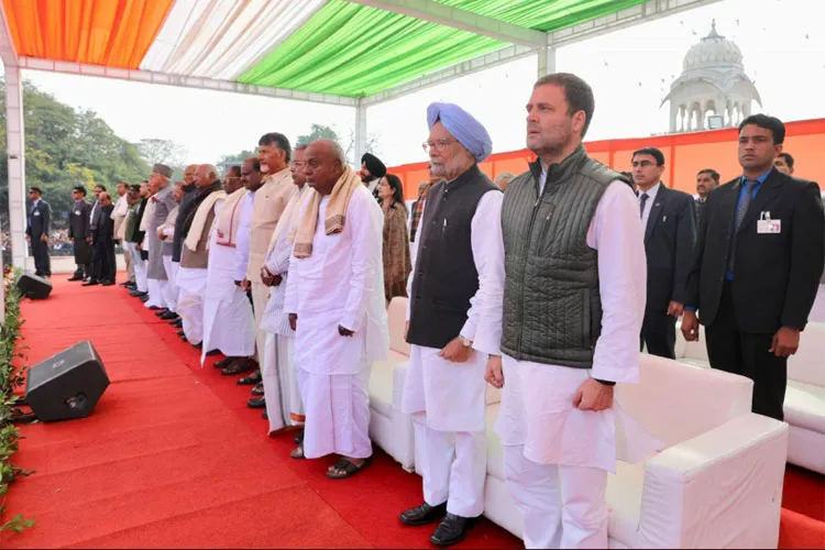 गत मई महीने में कर्नाटक में कांग्रेस-जद(एस) गठबंधन सरकार के शपथ ग्रहण कार्यक्रम के बाद यह दूसरा मौका था जब विपक्षी दलों के नेता इस तरह एक मंच पर नजर आए। विपक्षी एकजुटता का यह नजारा उस वक्त दिख रहा है जब तीन राज्यों में जीत के बाद कांग्रेस और राहुल गांधी राजनीतिक हैसियत की लिहाज से पहले की तुलना में खुद को बहुत बेहतर स्थिति में महसूस कर रहे हैं। राजनीतिक विश्लेषकों के मुताबिक इन तीनों राज्यों के चुनावी नतीजों के बाद विपक्षी एकजुटता के साथ राहुल गांधी के कद में इजाफा साफ तौर पर दिख रहा है। वैसे, इसकी बानगी शनिवार को तमिलनाडु में देखने को मिली जब द्रमुक नेता स्टालिन ने राहुल गांधी को प्रधानमंत्री पद का उम्मीदवार बनाए जाने पैरवी की।