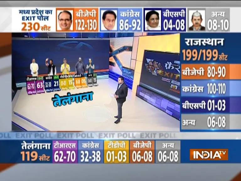 Telangana Exit Poll 2018: देश के 5 राज्यों में विधानसभा चुनावों का मतदान लगभग खत्म हो गया है और मतदान खत्म होने के बाद अब पाचों राज्यों के एग्जिट पोल की बारी है, इन पाचों राज्यों में सबसे आखिर में राजस्थान और तेलंगाना में आज मतदान हुआ है, तेलंगाना के मुख्यमंत्री के चंद्रशेखर राव ने समय से पहले विधानसभा भंग करके जल्द चुनाव का रास्ता साफ किया था जिस वजह से अन्य 4 राज्यों के साथ इस बार तेलंगाना में भी चुनाव हुए हैं। तेलंगाना के लिए India TV-CNX ने एग्जिट पोल किया है और इस एग्जिट पोल के नतीजे इस तरह से हैं।