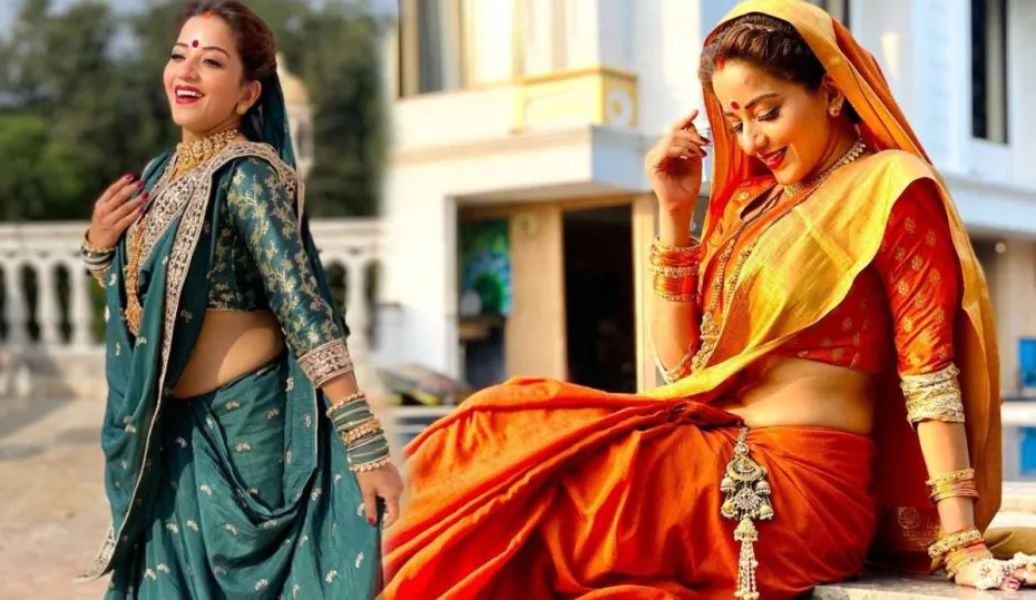 हल्के नारंगी और पीले रंग की साड़ी में मोनालिसा बेहद खूबसूरत लग रही हैं। उन्होंने कमर पर कमरबंद पहना हुआ है। हाथों में ढेर सारी चूड़ी और गले में ज्वैलरी पहने मोनालिसा का अलग ही अंदाज देखने को मिला है।