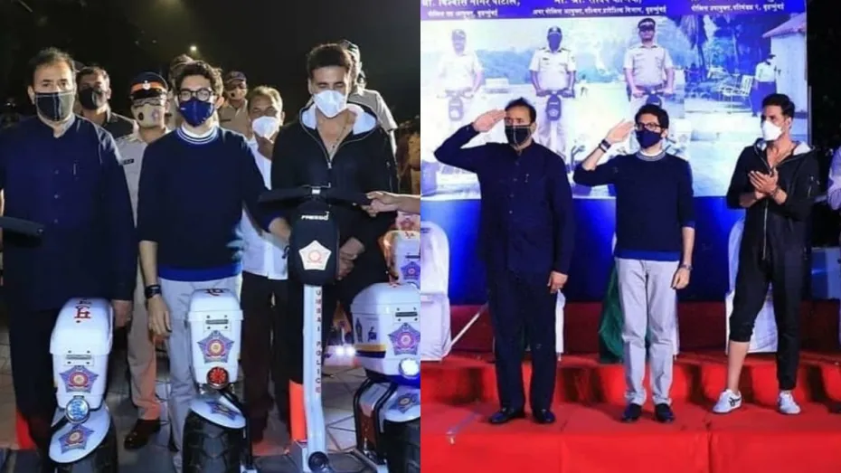मुंबई: बॉलीवुड सुपरस्टार अक्षय कुमार ने महाराष्ट्र के पर्यटन और पर्यावरण मंत्री आदित्य ठाकरे और गृह मंत्री अनिल देशमुख के साथ मुंबई पुलिस के एक समारोह में शिरकत की। शनिवार शाम को हुए इस कार्यक्रम में मुंबई के पुलिस प्रमुख परम बीर सिंह ने भी भाग लिया। पुलिस कर्मियों को बांद्रा समुद्र किनारे बेहतर गश्त के लिए सेगवे (इलेक्ट्रिक बाइक) दिया गया।