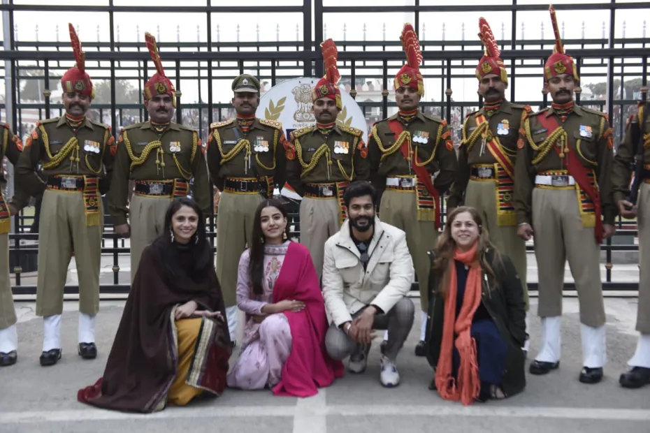 मुंबई: फ़िल्म 'भांगड़ा पा ले' इन दिनों सुर्खियों का हिस्सा बनी हुई है। हाल ही में फिल्म के निर्देशक स्नेहा तौरानी के साथ फ़िल्म की टीम ने अमृतसर के वाघा बॉर्डर और गोल्डन टेम्पल का दौरा किया। उत्तर भारत की सर्दियों को मात देते हुए सनी कौशल और रुखसार ढिल्लन ने समारोह में भाग लिया, जहाँ रुखसार एथनिक सूट में नजर आईं और सनी हमेशा की तरह हैंडसम हंक लुक में नज़र आये।