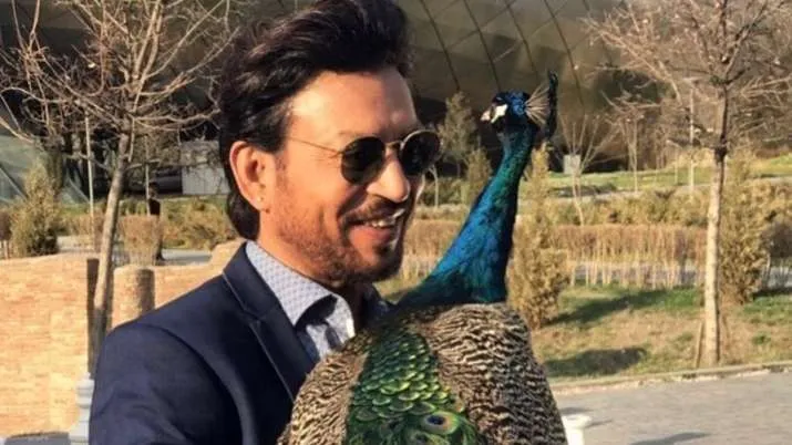 शेयर तस्वीर में इरफान खान नीले रंग के सूट में नजर आ रहे हैं और उनके हाथ पर मोर बैठा है। वह मोर की तरफ देखते हुए मुस्करा रहे हैं।
