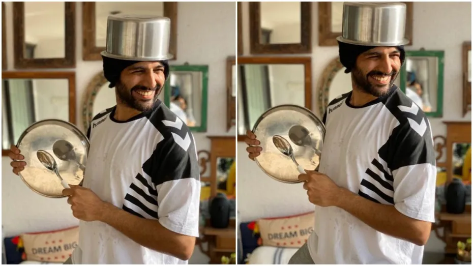 शेयर की गई तस्वीर में आर्यन अपने हाथों में 'थाली, चम्मच' और सर पर 'भगोना' रखे हुए दिखाई दे रहे हैं।