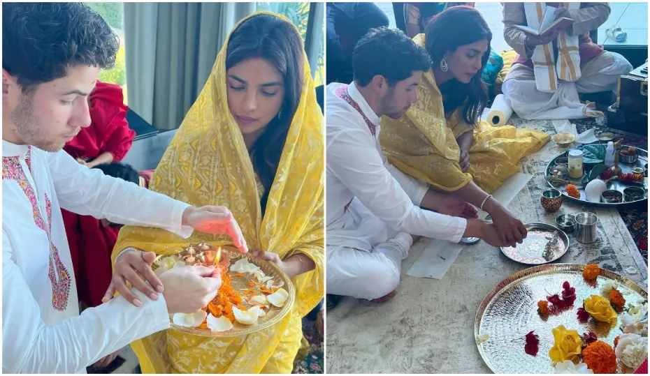 इस खास मौके पर प्रियंका और निक दोनों ही ट्रेडिशनल वेयर में नज़र आए। सिर पर पल्लू और मांग में सिंदूर भरे प्रियंका ने पीले रंग की साड़ी पहनी, जिसमें वो बेहद खूबसूरत नज़र आईं। वहीं, निक सफेद रंग के कुर्ते-पायजामे में हैंडसम दिखाई दिए।