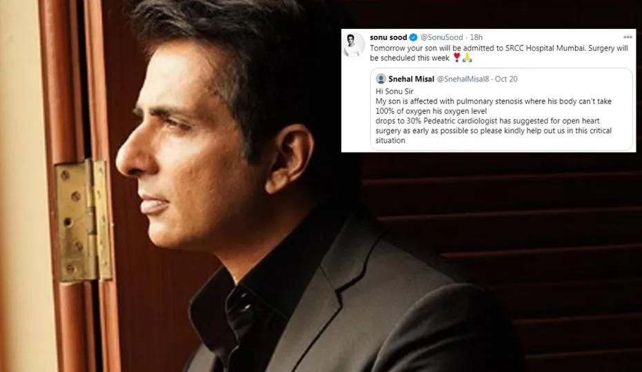 सोनू सूद ने एक ट्वीट किया, जिसमें उन्होंने एक लड़के की सर्जरी कराने का वादा किया। उन्होंने जरुरमंद यूजर को रिप्लाई करते हुए लिखा कि आपका बेटा हॉस्पिटल में एडमिट हो जाएगा। इसी हफ्ते उसकी सर्जरी होगी।